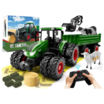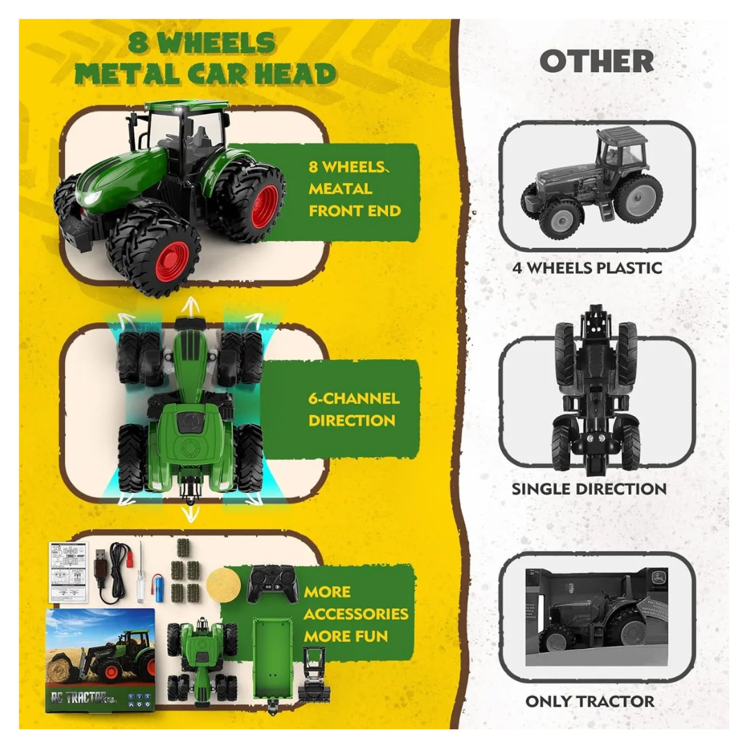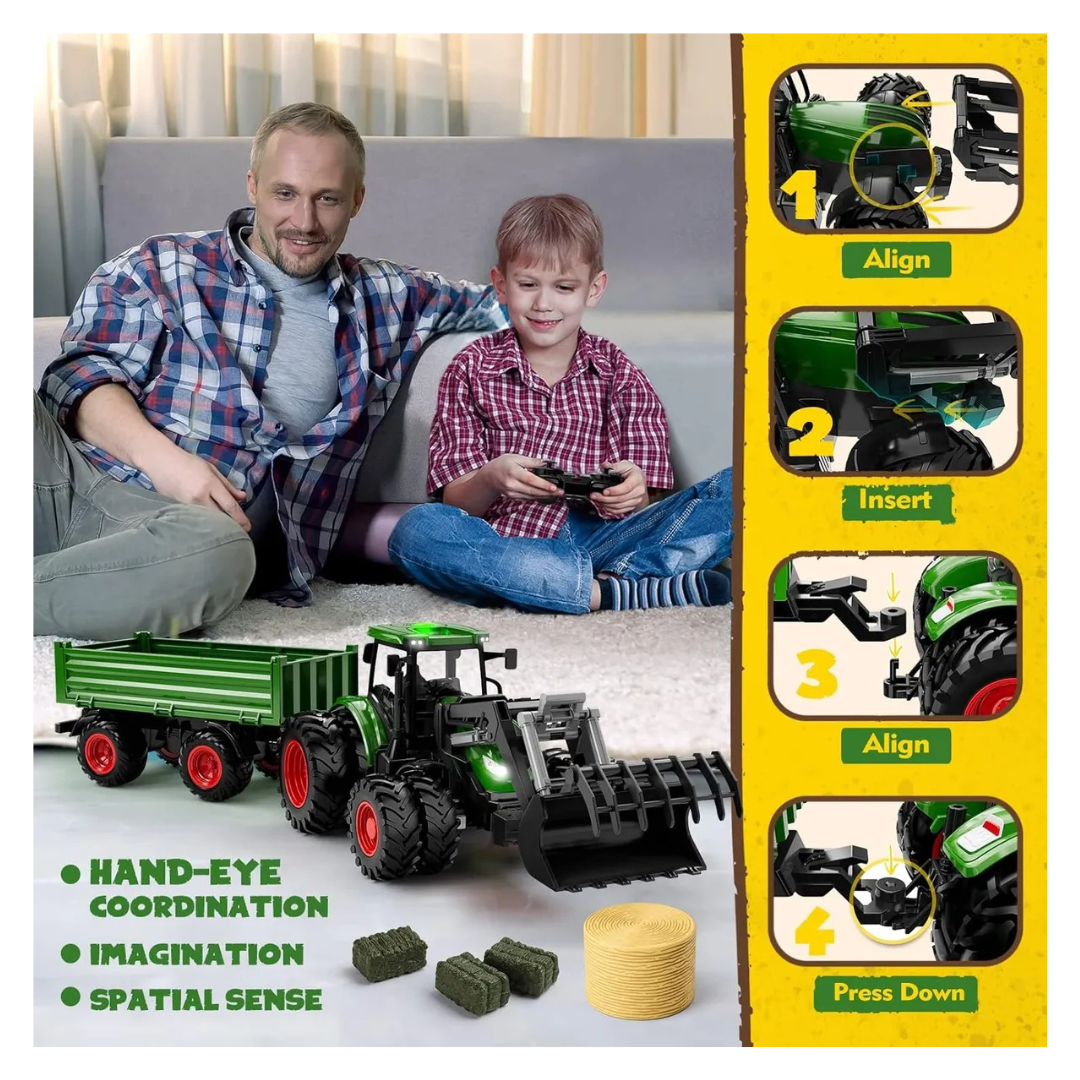 Juego de tractores de control remoto mejorado: este juego de tractor de diseño único cuenta con un cabezal de tractor de metal, 8 ruedas, control remoto de 2.4 GHz, cargador frontal, remolque volquete, gancho mejorado, luces de trabajo y accesorios realistas de granja, incluyendo vaca, oveja, pacas cuadradas de heno y balas de heno redondas (dimensiones del tractor: 15.5 x 48 centímetros)